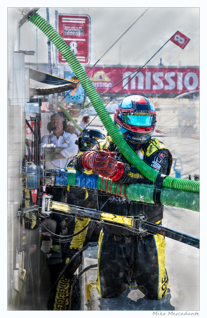 Laguna Seca, CA - 2023 Indy Car Grand Prix. Sometimes you turn around a look in a different direction and you see a story to capture. Which is exactly what happened during this race. In this case I reacted to the moment, took the picture, and knew it was an interesting story. I deliberately applied a pencil sketch effect to the image and then blended back parts of the original image at selective levels of opacity to create this image.